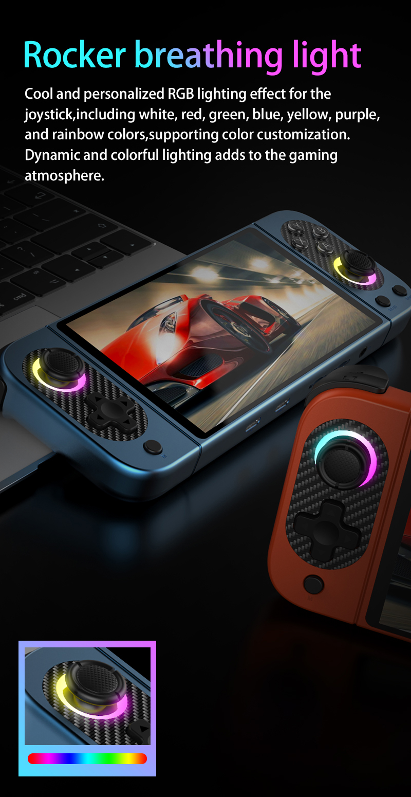 Cool and personalized RGB lighting effect for the joystick, including white, red, green, blue, yellow, purple, and rainbow colors,supporting color customization.