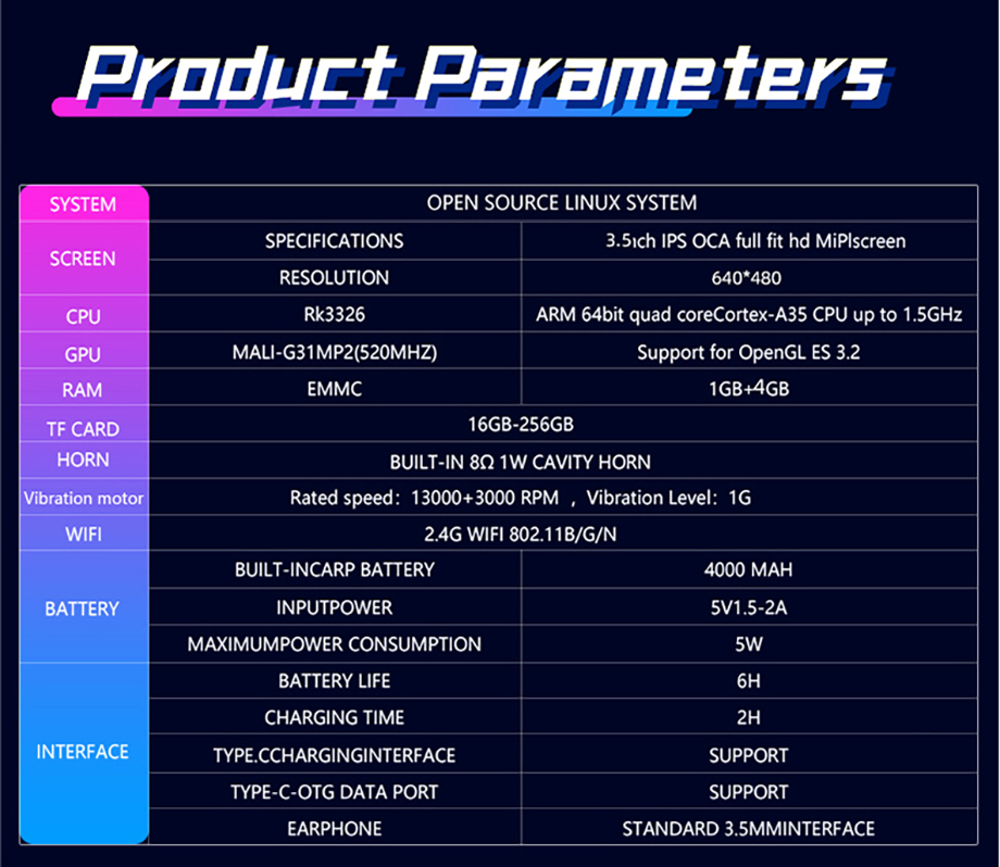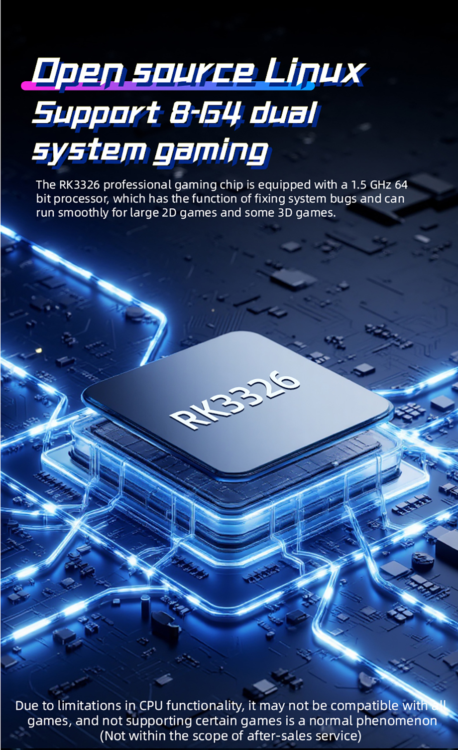 The RK3326 professional gaming chip is equipped with a 1.5 GHz 64 bit processor, which has the function of fixing system bugs and can run smoothly for large 2D games and some 3D games.