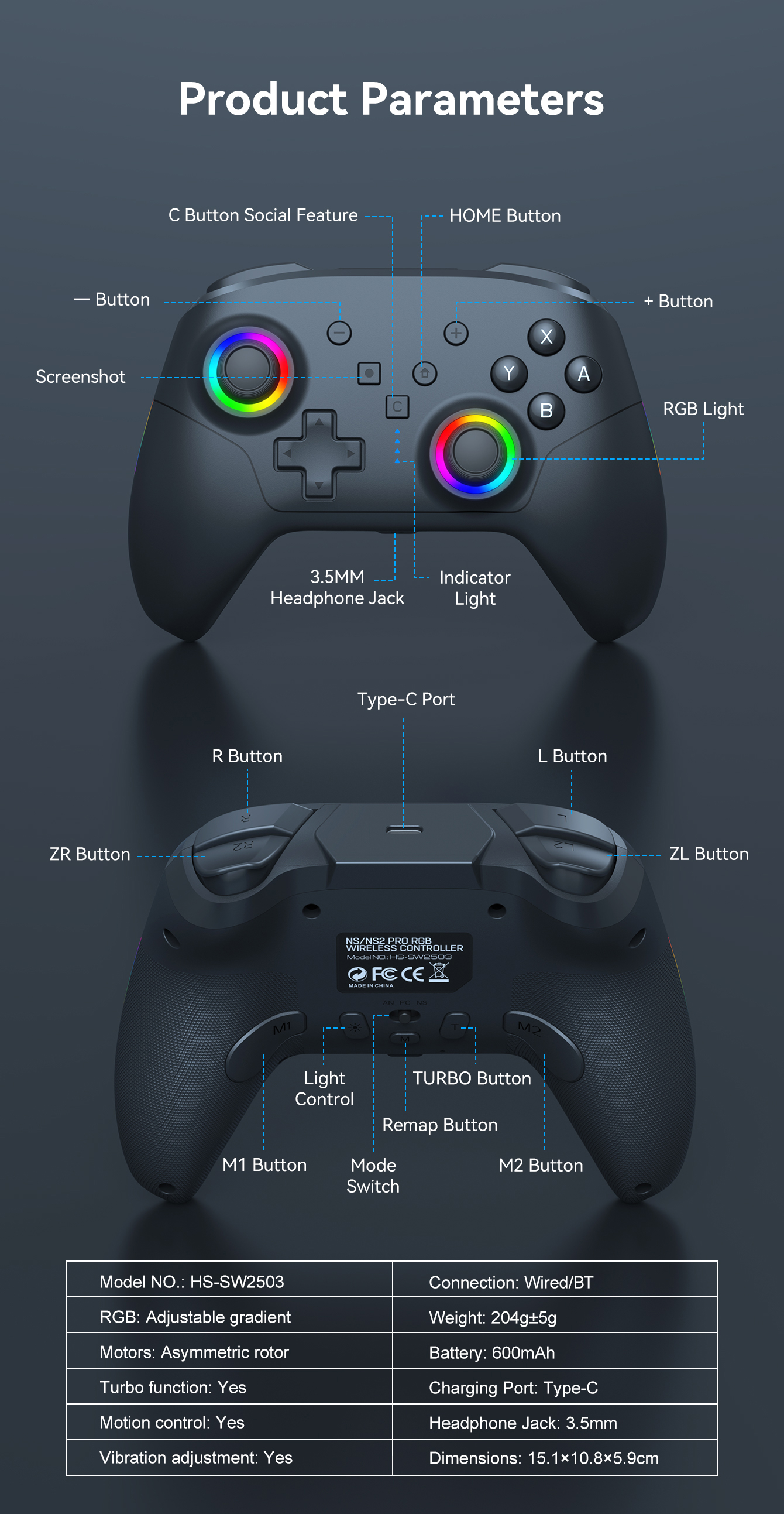 HS-SW2503 NS/NS2 PRO RGB Wireless Game Controller Adjustable Vibration Motors Built-in nine-axis gyroscope