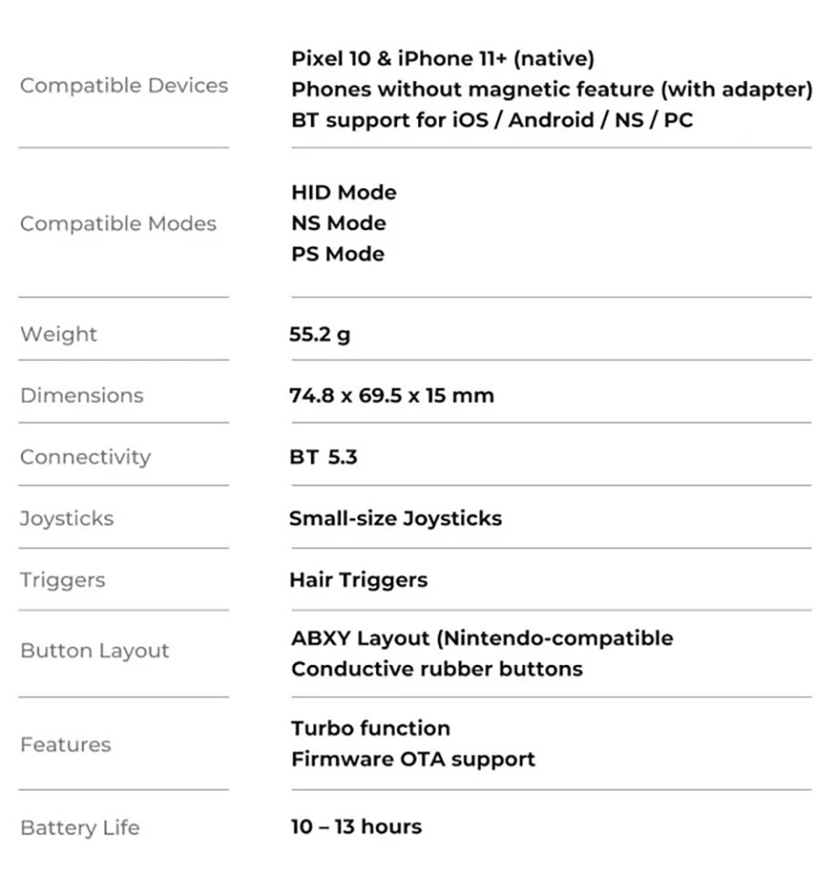 | Compatible Devices | Pixel 10 & iPhone 11+(native) Phones without magnetic feature(with adapter) BT support for iOS / Android / NS/PC |