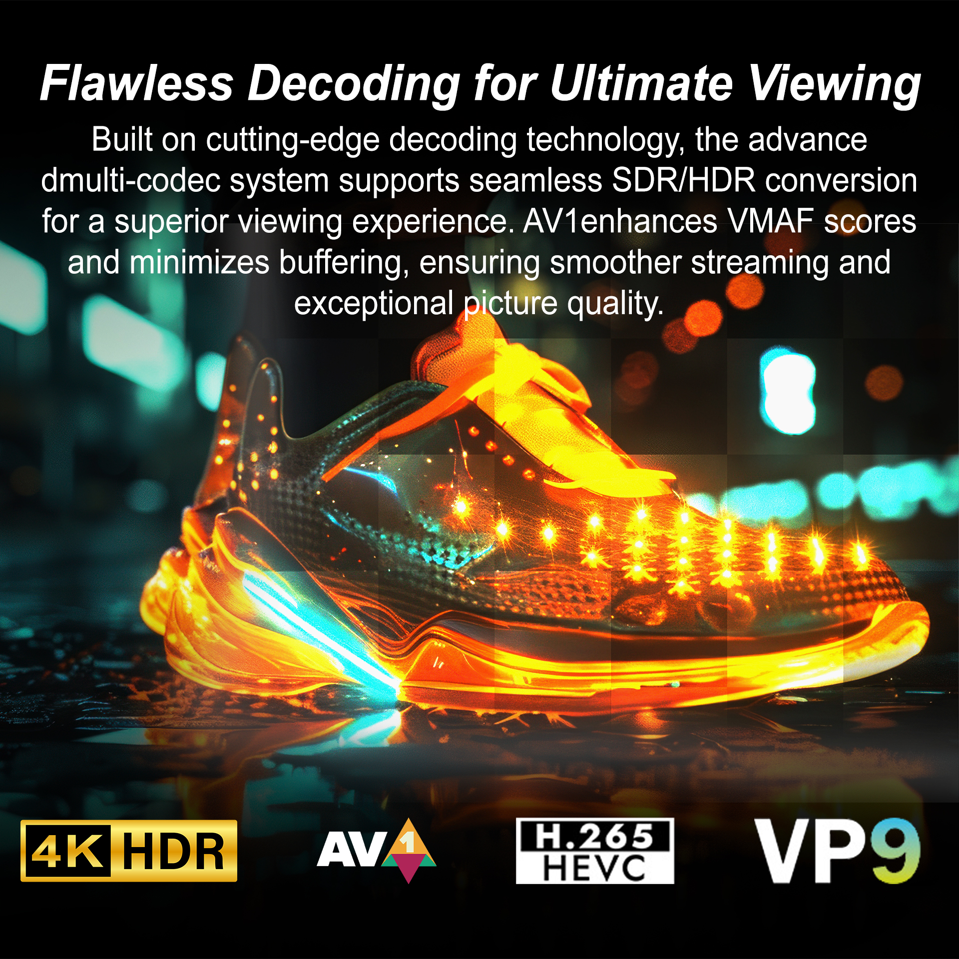 Built on cutting-edge decoding technology, the advance dmulti-codec system supports seamless SDR/HDR conversion for a superior viewing experience.AV1enhances VMAF scores and minimizes buffering, ensuring smoother streaming and exceptional picture quality.