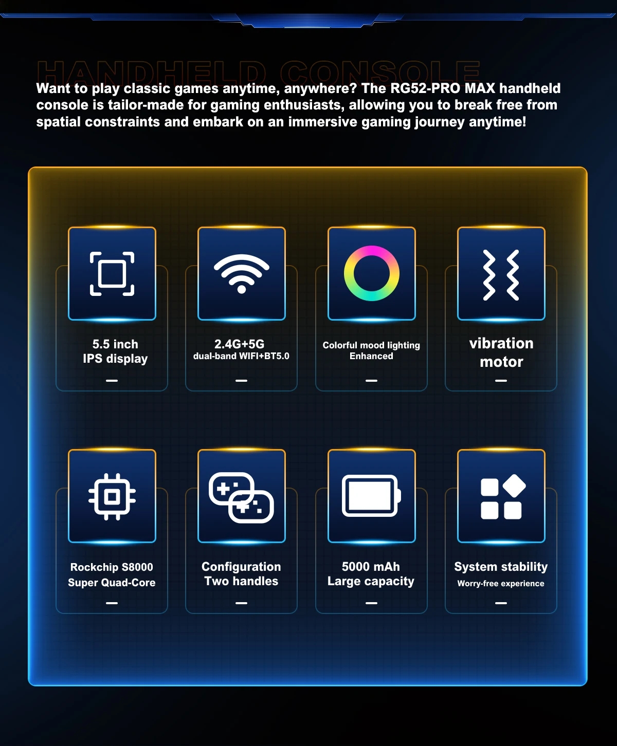 Want to play classic games anytime, anywhere? The RG52-Pro MAX handheld console is tailor-made for gaming enthusiasts, allowing you to break free from spatial constraints and embark on an immersive gaming journey anytime!